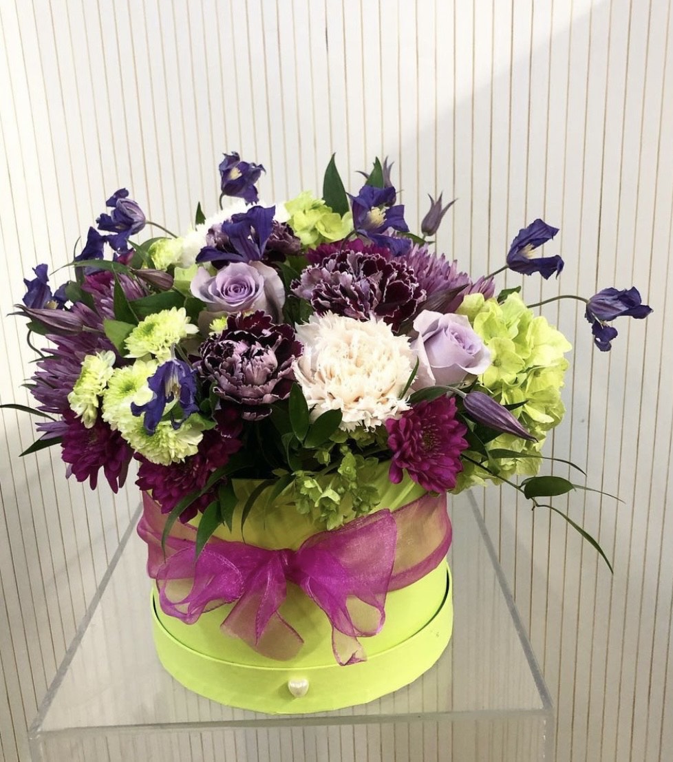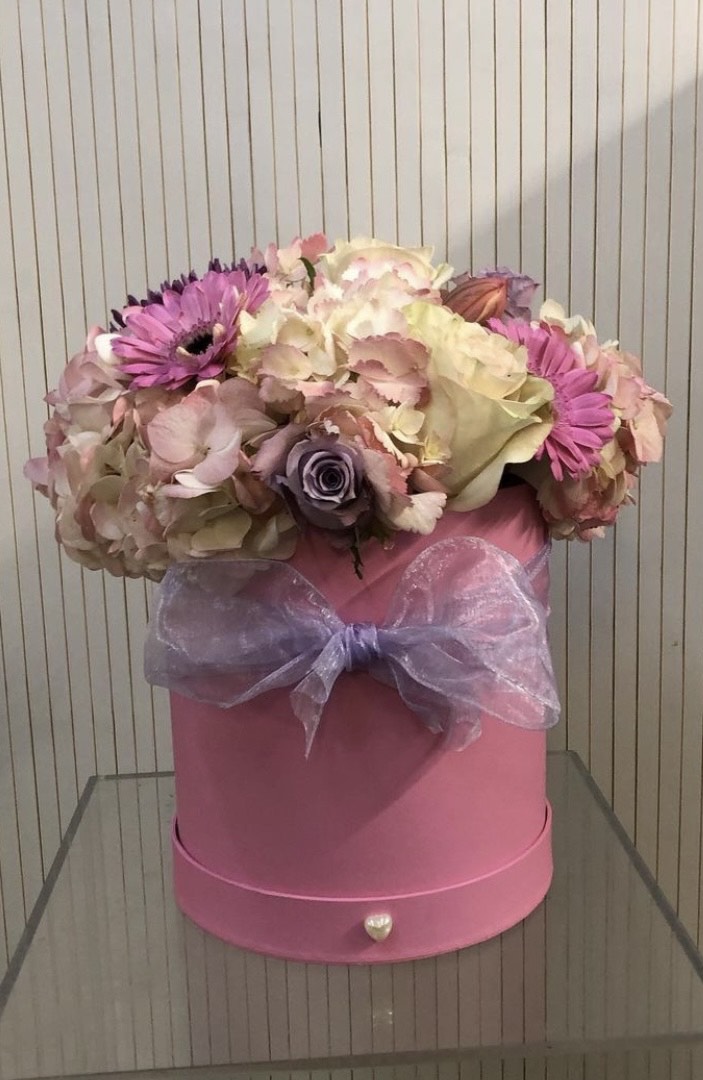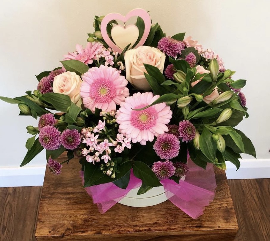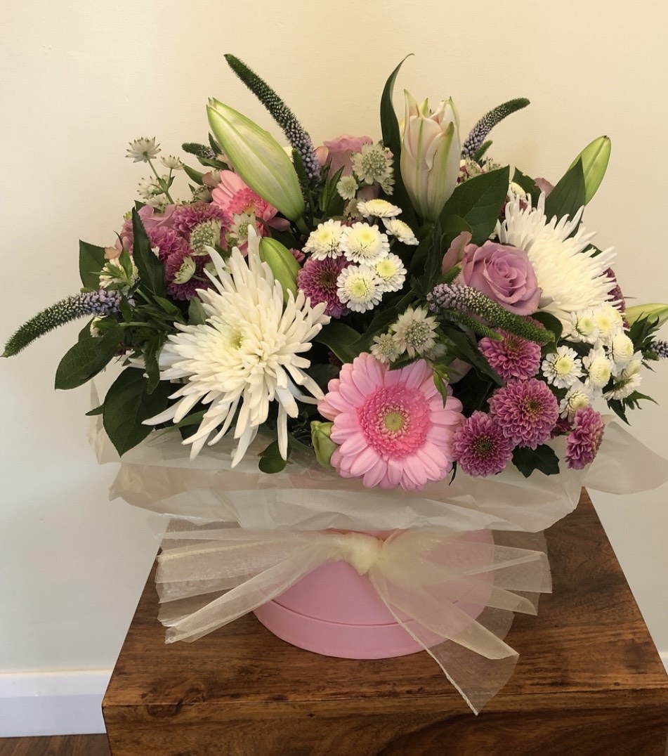 Looking for something a little different? Why not choose one of our luxury hat box. A typical hat box could contain, Hydrangea, Luxury Roses, Lilies and more seasonal flowers, along with a mixture of green and gold foliage. Picture shown is of £65 hat box bouquet.